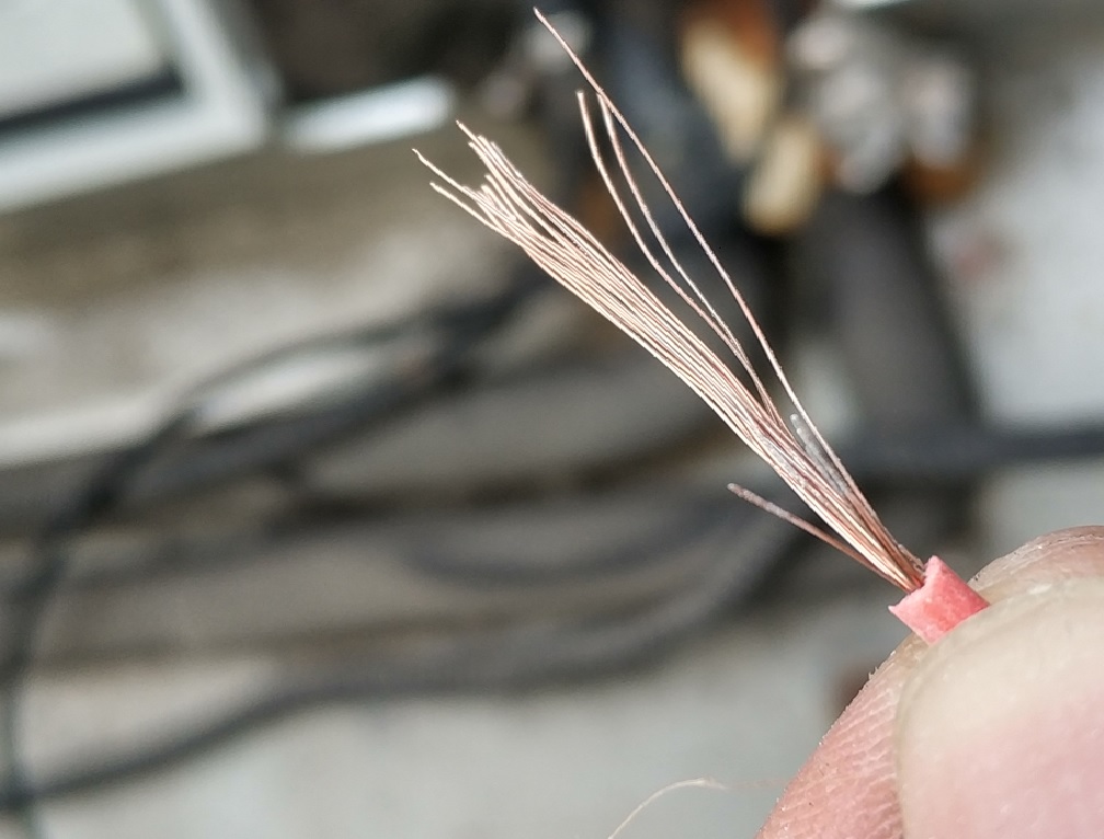 找到问题,故障很快就排除了;把原线缆裁了一截出来剥皮检查,发现线缆里的铜芯不同位置不同程