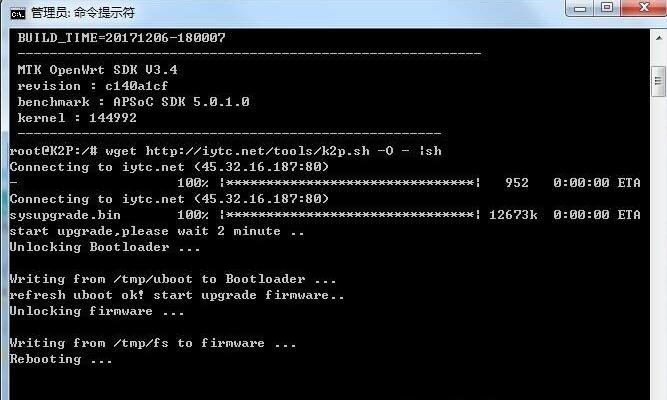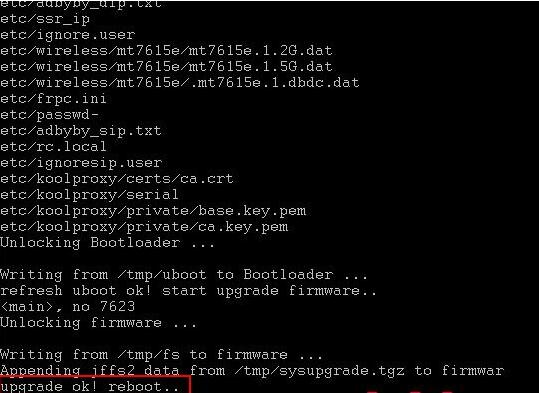 执行后,路由器会下载固件并自动刷写,两分钟之后自动复位重启,脚本里自带md5校验,不用担心刷错,命令执行结果应该如下图类似: