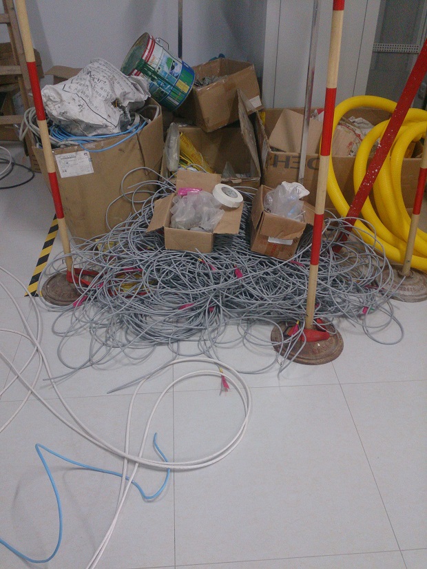 机房施工有明确的要求,物料摆放区域、废料放置区域、工具摆放区域都一一区分开来。一天的干活有班前会
