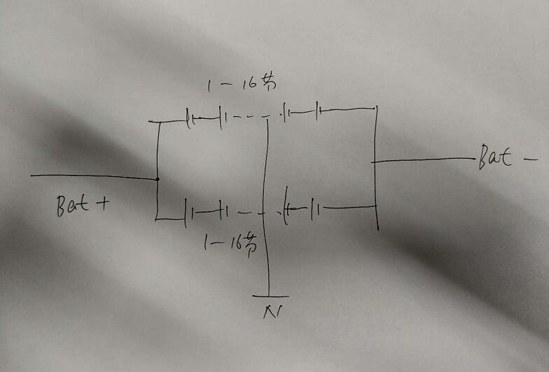 电池全部串联,然后再16-17节电池的正负极连接端接一条线出来作为N极(也有称之为“接地”和“公共端”。),